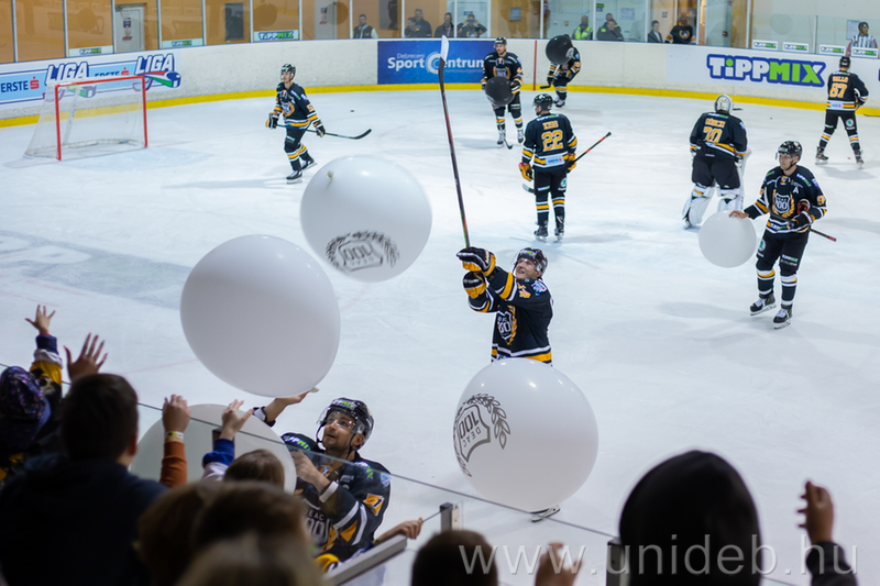 A lefújást követően jókora fekete és fehér lufik lepték el a Jégcsarnok légterét a DEAC 100 éves jubileumának tiszteletére. A lufikat a játékosaink ügyesen a lelátó felé terelték, a nézők pedig csokikkal viszonozták az ajándékot. Hétfő este 18:30-tól újabb hazai találkozó vár a csapatra. A tavaly drámai csatában, a negyeddöntőben búcsúztatott Gyergyói HK lesz a DEAC ellenfele.