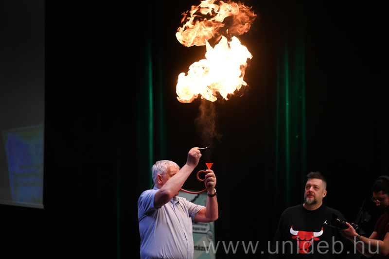 Az ország legismertebb fizikatanára, Härtlein Károly – ahogy alig több mint egy hónapja – ezúttal is úgy mutatta be a fizikát, ahogy bárki megszeretheti, megértheti. Főként azok a 6-12. évfolyamos diákok, akik most is lélegzet-visszafojtva figyelték a látványos kísérleteket.