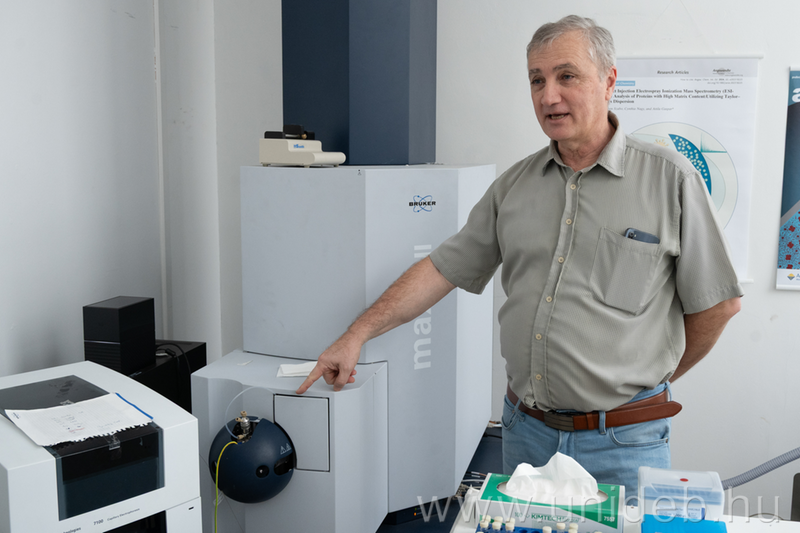 - Az analitikai kémia az a tudományterület, amivel bizonyos komponenseket, azok mennyiségét és minőségét igyekszünk meghatározni, akár olyanokét is, amiket korábban esetleg nem tudtunk. Az olyan nagy molekuláknak, mint a fehérjék, nagyon sok, egymástól alig különböző variánsuk van. A gyógyszeripar egyik fontos kihívása, hogy ezeket a variánsokat próbálja kiszűrni, kontrollálni. Erre szolgál a tömegspektrometria – tájékoztatott Gáspár Attila, a Debreceni Egyetem Természettudományi és Technológiai Karának analitikai kémiával foglakozó egyetemi tanára.